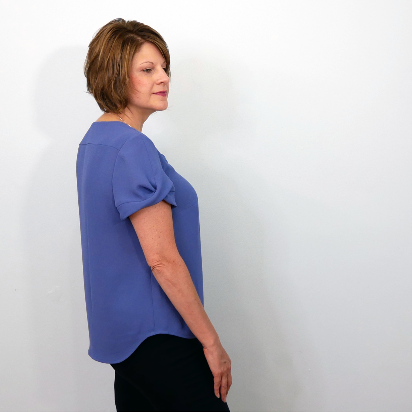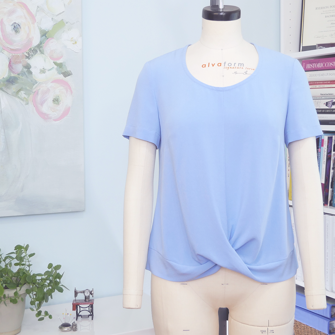Lila is a sewing pattern for a woven blouse with a twist. View A features a center front seam with a pretty twist that cleverly forms into a bottom hem band. View B features the same lovely twist detail on the sleeve with a simple shirt-tail hem on the body. Both views feature a scooped neckline finished with a bias neck binding, a double layer back yoke and side bust darts. Sleeve styles are interchangeable giving you the option for two more style variations using the same pattern pieces.